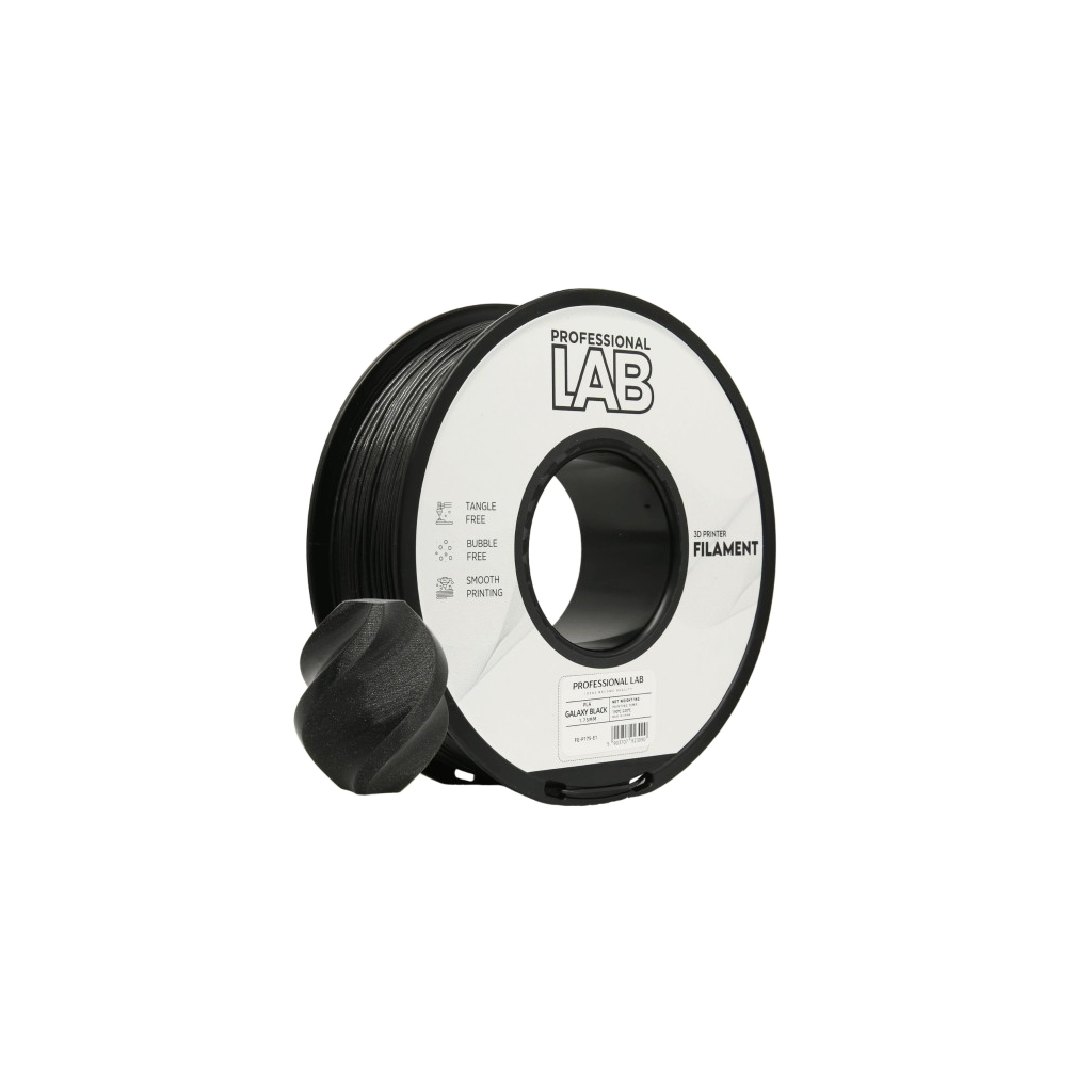 PROF. LAB PLA GALAXY BLACK je vysoce kvalitní PLA filament pro 3D tisk v elegantní černé barvě s jemným metalickým (galaxy) efektem. Díky pečlivě řízené výrobě nabízí stabilní průměr, spolehlivý tisk a výborný vzhled hotových modelů. Je ideální volbou pro všechny, kteří chtějí spojit snadný tisk PLA materiálu s působivým designem výtisků.